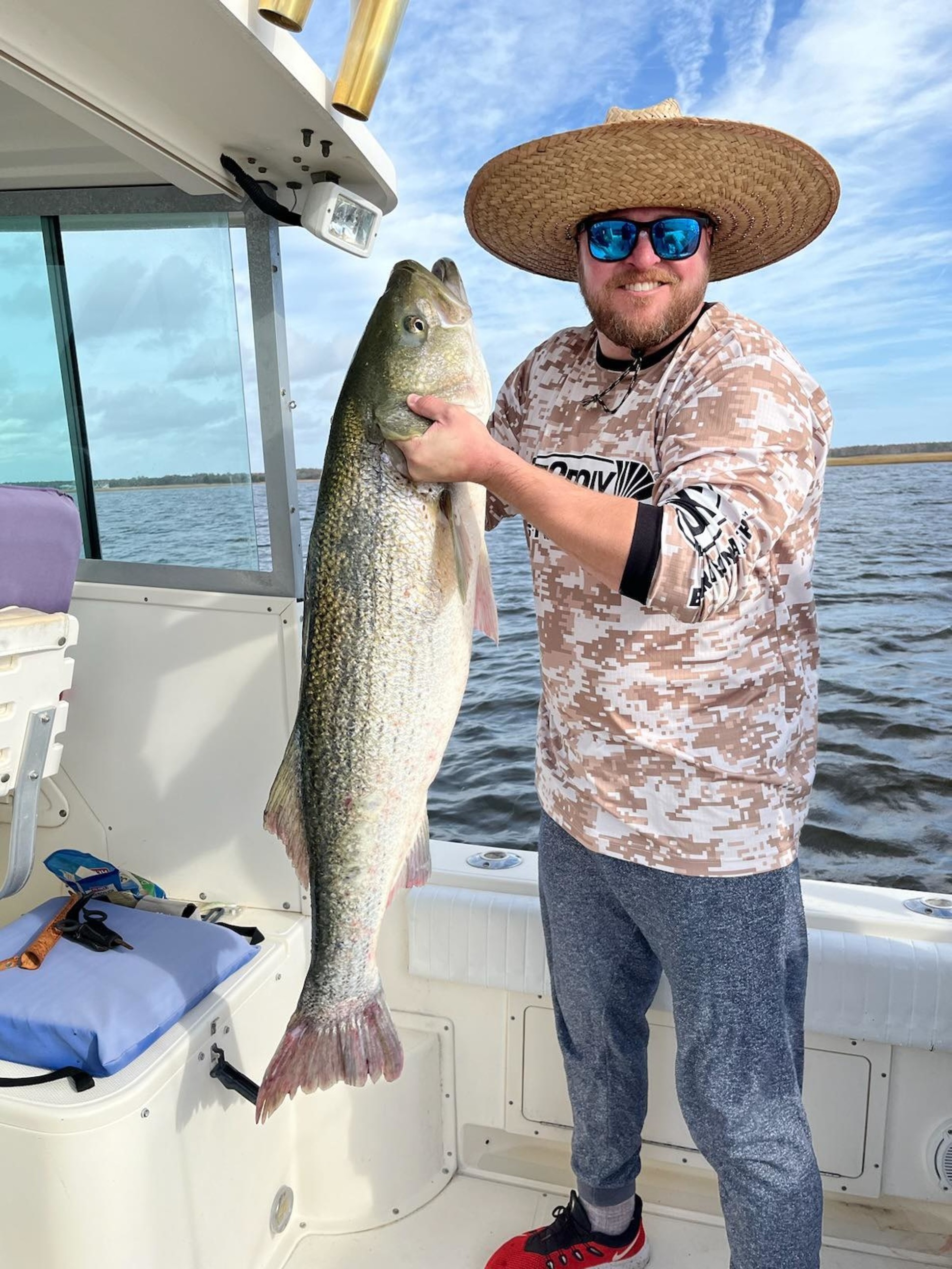 This is the fishing report for the week of 11/14/22. Lots to report this week which is unusual for this time of year. Carl Ray from Mount royal, NJ came in for some advice and it paid off. He went to the mouth of the Great Egg River and caught this beautiful 44 inch bass. It was safely released.