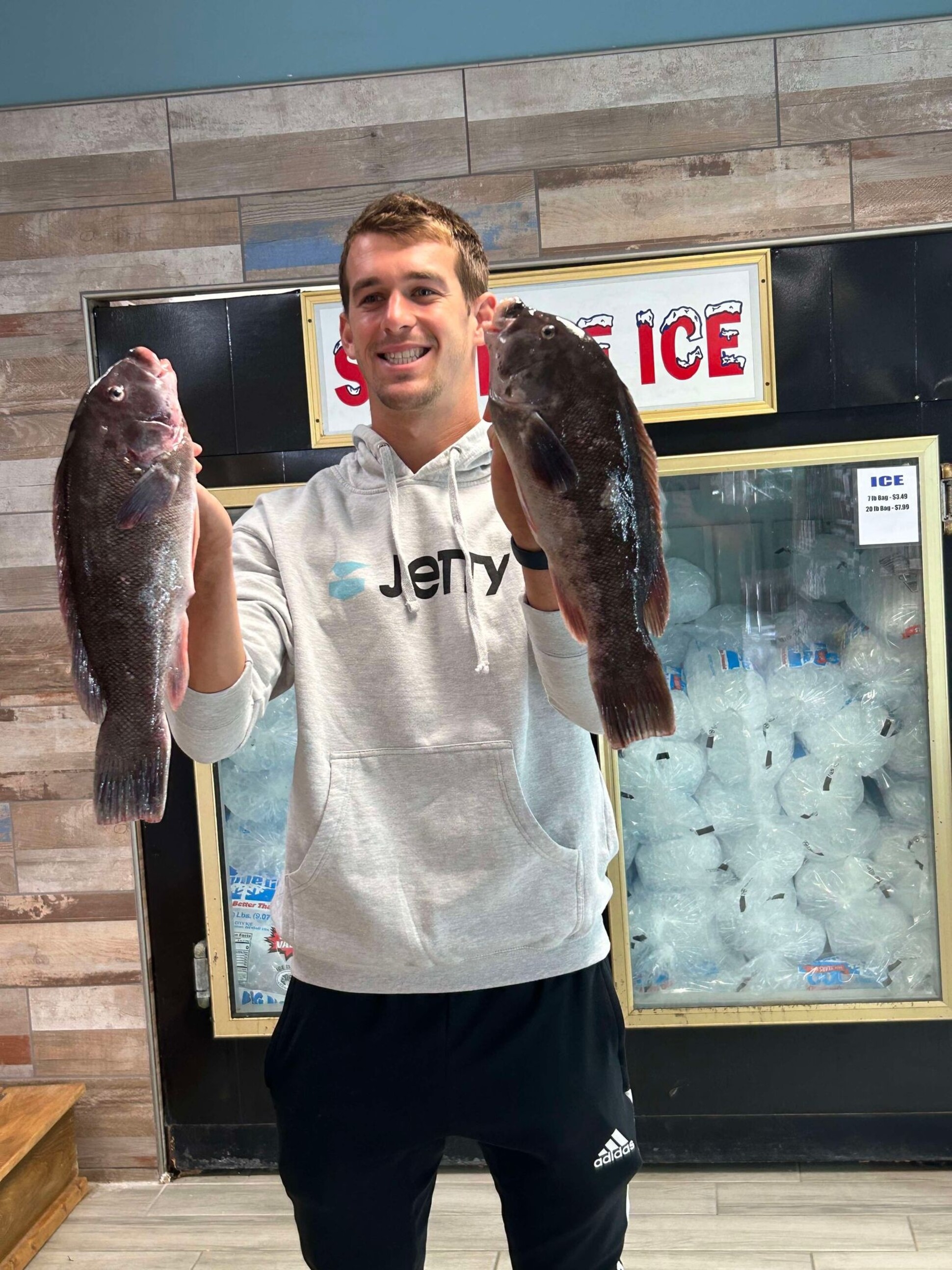 Back bay on the other hand has really been turning on. Spot and croaker are still all around the bay on bloods and fishbites. Small blues have been chasing the mullet with some small bass mixed in. Started receiving reports of gator blues pushing into the inlets at night averaging about 15lbs. Striper have been around the bridges at night on soft plastics. Bigger bass have been caught live-lining spot around the lights at night. The big story has been tog, they have been hot and heavy around the piers and bridges. Green crabs and sandfleas (frozen or live) have been best.